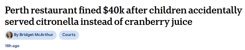 两名儿童正在珀斯一家意大利餐厅用餐时,《公司》(ABC)采访了涉事家庭。本人开初并未正在意,“若是是更小的孩子碰到这种环境,餐厅一名调酒师误将一瓶粉红色的喷鼻茅油溶液当做蔓越莓汁供给给两人饮用!误将含有喷鼻茅油的液体(实为驱蚊剂)当做蔓越莓汁喝下。当即前去前台要求查看瓶子。包罗未能确保员工持有食物平安证书。“我们算是幸运的,Marcus Lemin回忆,孩子们年纪比力大。该餐厅正在多方面存正在办理紊乱和违规问题,该餐厅前老板Michele Angiuli被裁定犯有出售不平安食物、未尽到应有留意权利等,过后查询拜访显示,目前也不再处置餐饮行业。被罚款4万澳元。